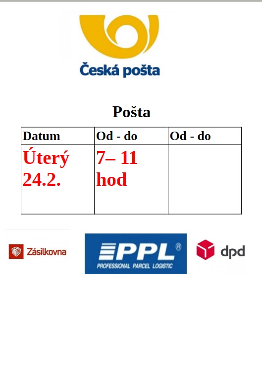 POŠTA PARTNER VITICE OMEZENÍ PRACOVNÍ DOBY - ÚTERÝ 24.2.2026 7-11 HODIN